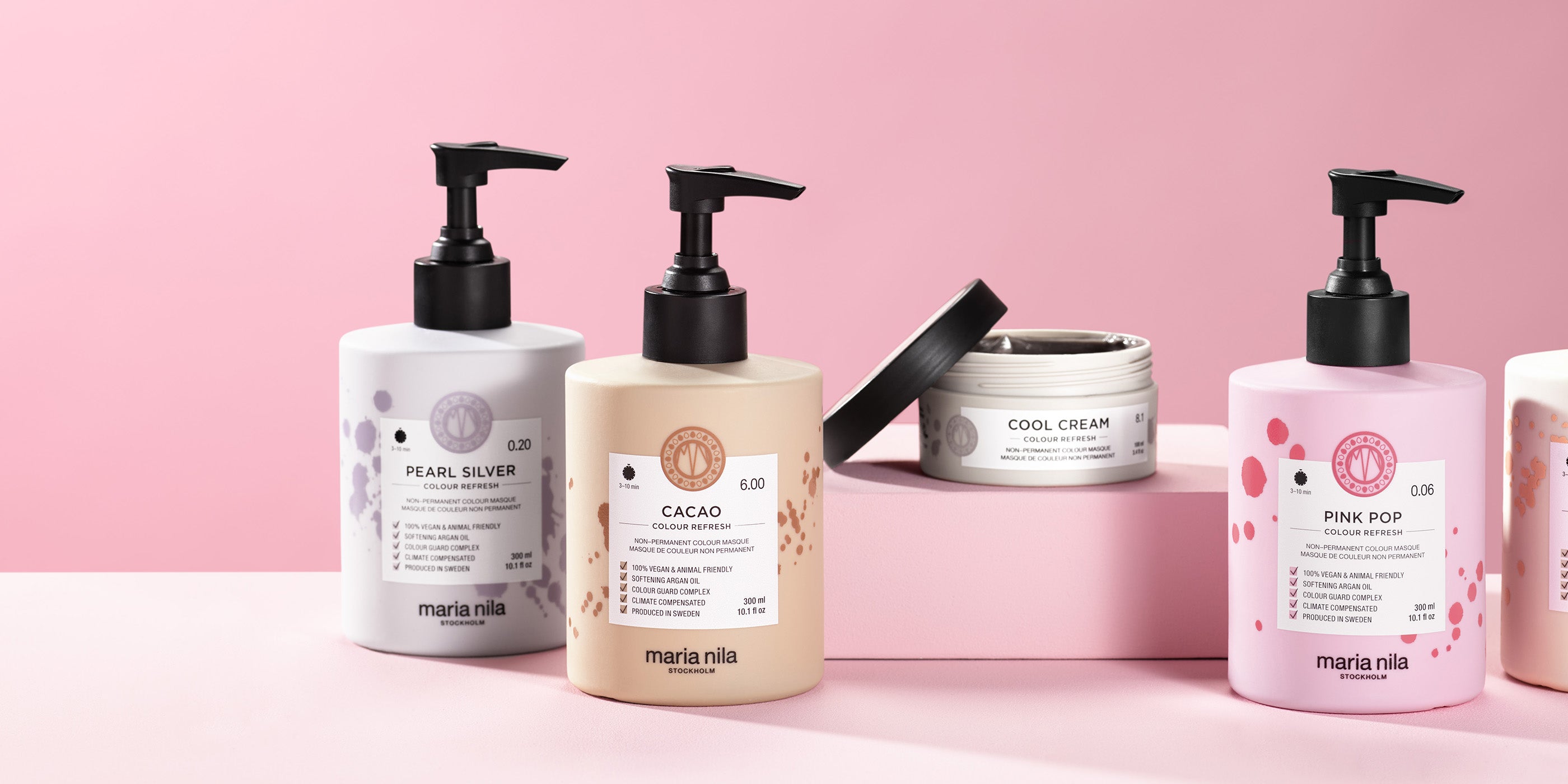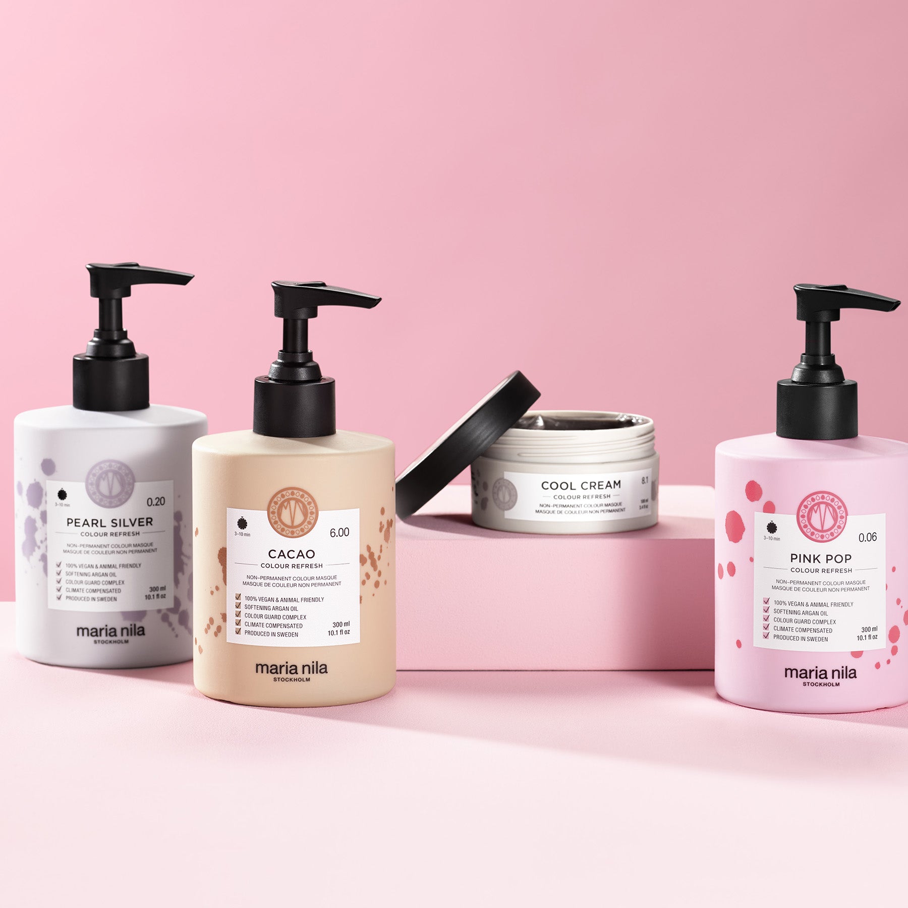 Shampoo the hair twice, then towel dry it. Apply the Colour Refresh and let it sit for 5-10 minutes before rinsing. Towel dry again before applying the final color. Mix Colour Refresh pigments to achieve your desired shade, and dilute with White Mix or another unpigmented hair masque if needed.